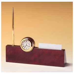 - 9" x 9" x 2 1/4" Gold Metal Golfball Clock on Rosewood Piano Nameplate, Business Card Holder, Pen